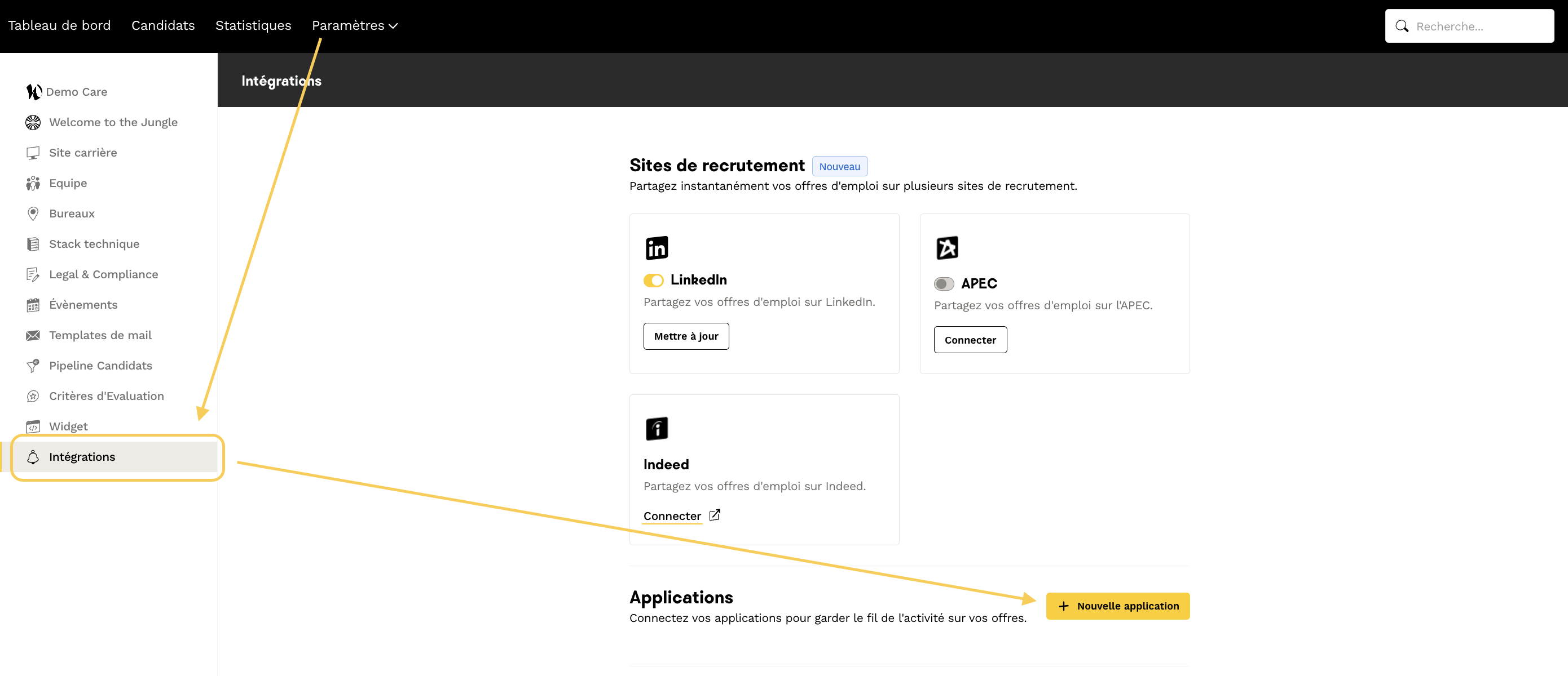 Si vous souhaitez être informé(e) en temps réel de toutes les candidatures et de tous les évènements, vous pouvez configurer une intégration Slack en cliquant depuis l'ATS sur : Paramètres > Intégrations > + Nouvelle application :