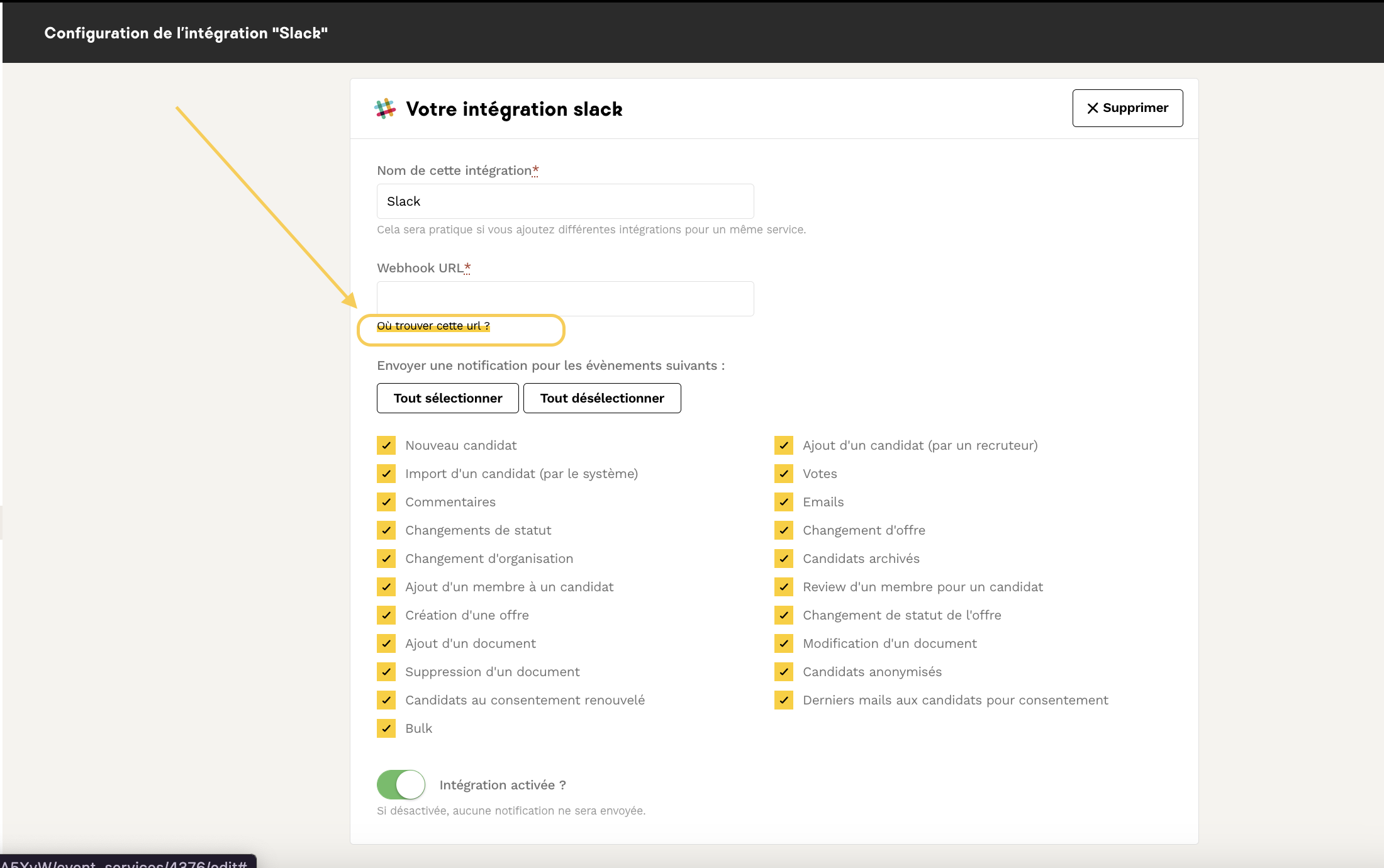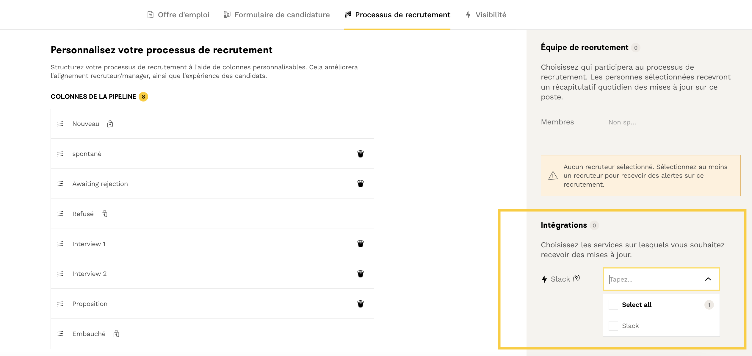 - Relier les notifications de chaque offre au channel concerné le champ "Intégrations" du formulaire d'édition de l'offre (section "Processus de recrutement) :