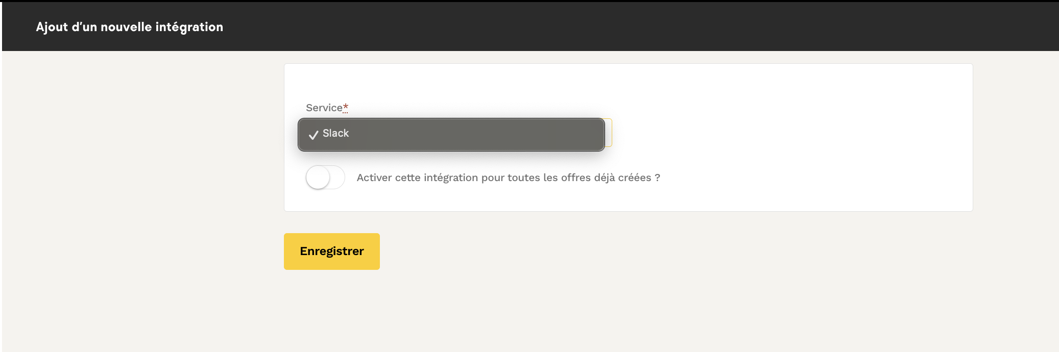 Ensuite sélectionnez l'option "Slack" puis Enregistrer :