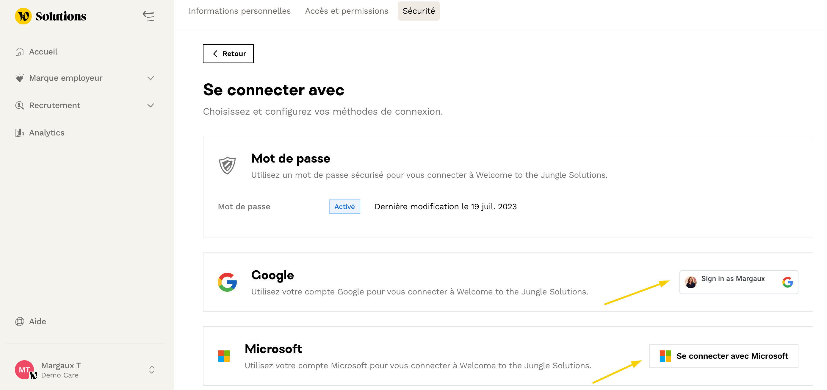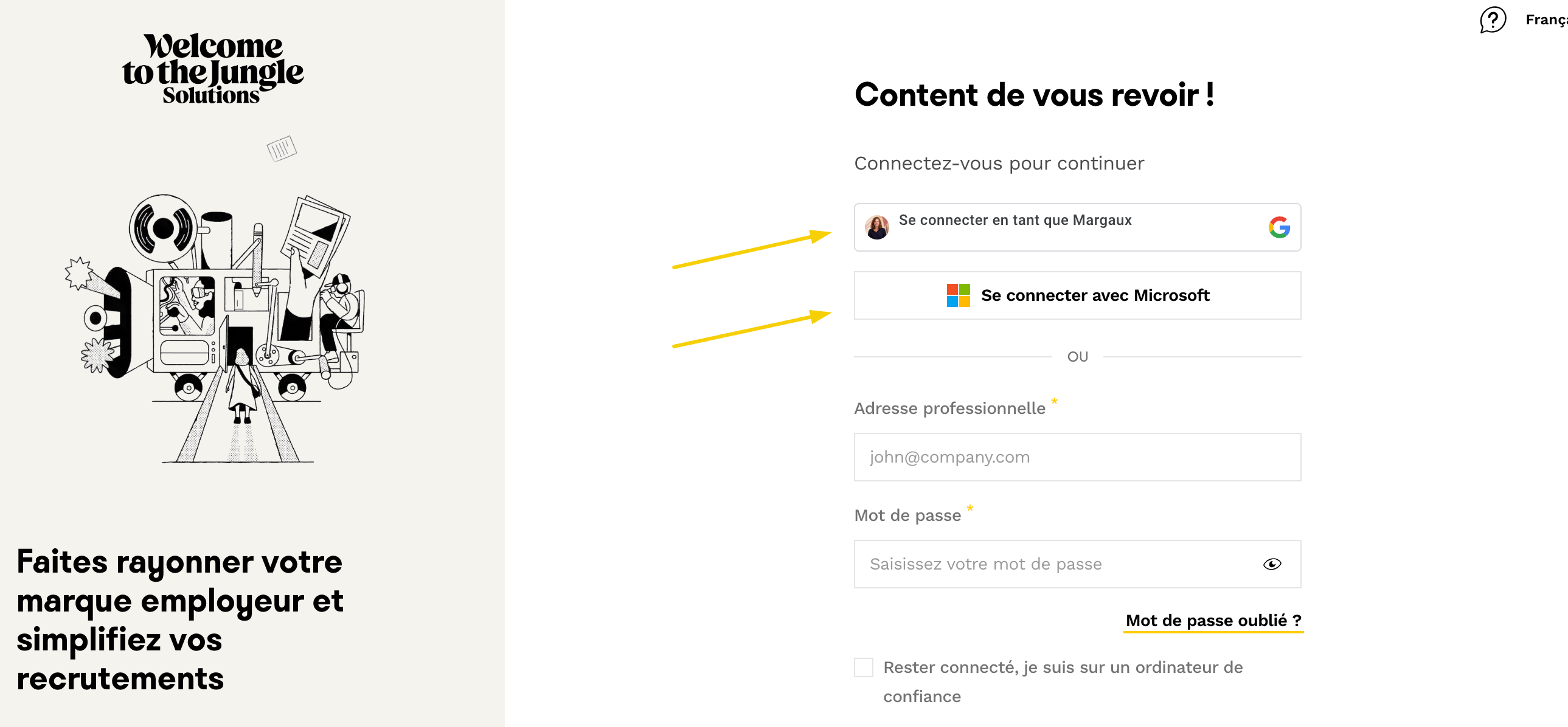 Si vous disposez d'une adresse Gmail ou Microsoft, vous pouvez désormais la lier à votre compte Welcome to the Jungle Solutions pour vous connecter en toute simplicité grâce au bouton Google Connect ou Microsoft Connect !