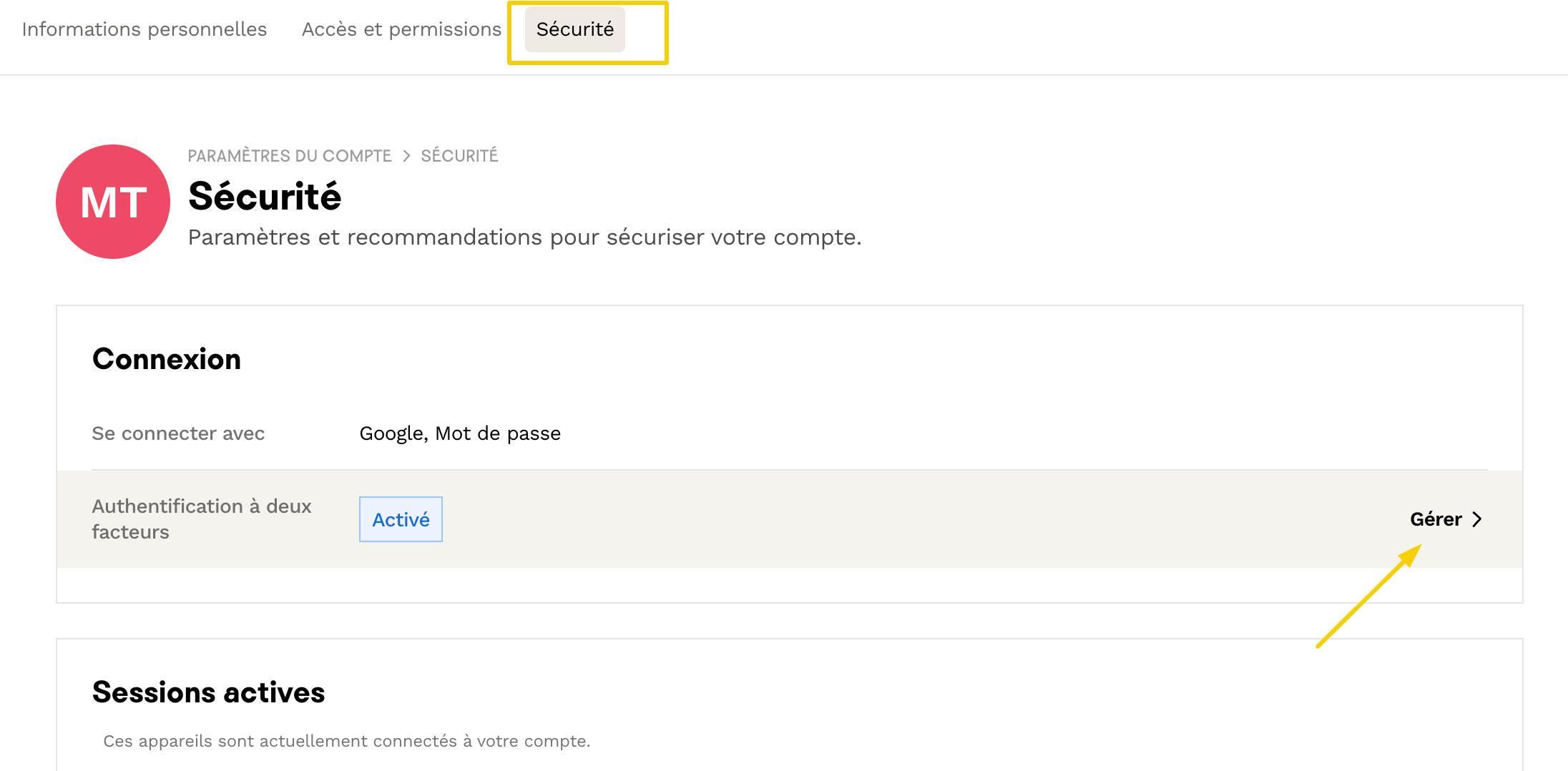 Une fois sur la page, cliquez sur l'onglet "Sécurité", puis "Gérer" depuis l'encart "Connexion > se connecter avec" :