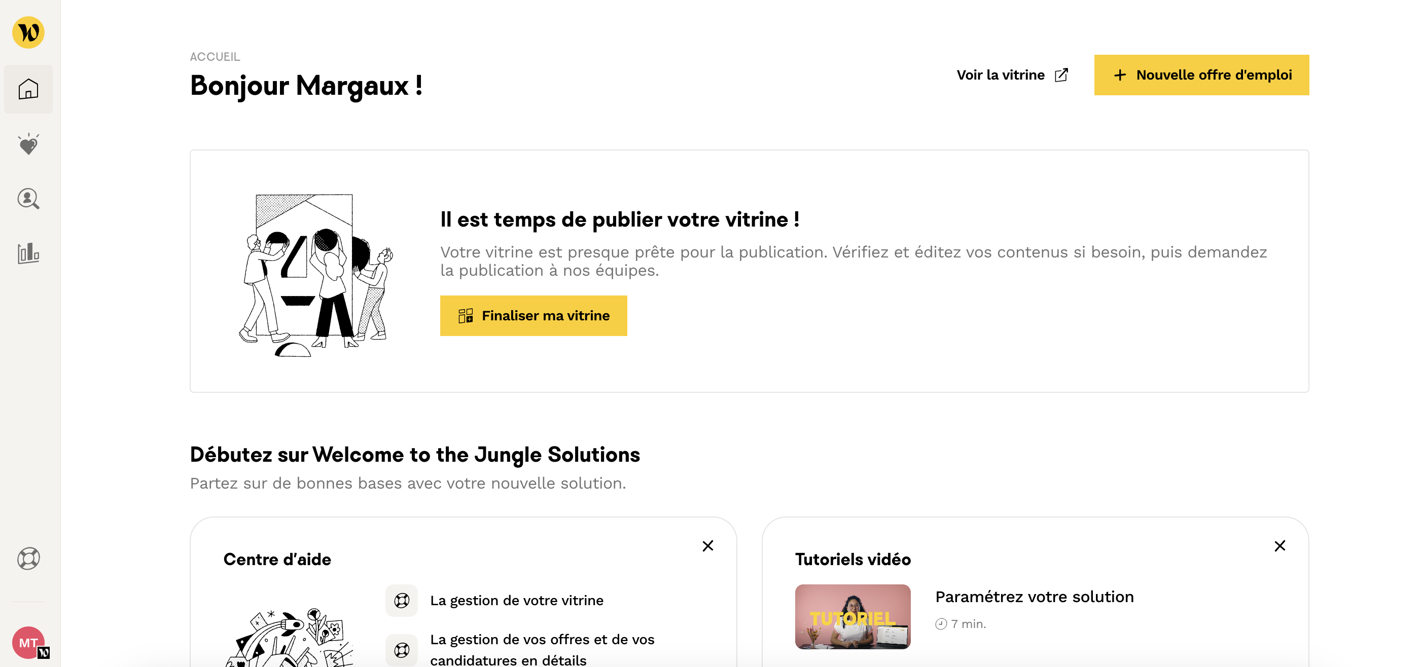 Cette page donne accès à toute la suite de Welcome to the Jungle. C'est de là que tout part, et où vous pourrez retrouver les informations clés relatives à notre actualité, nos produits, la gestion de vos membres (si vous avez un compte administrateur sur Welcome to the Jungle Solutions ATS), et vos paramètres personnels aussi.