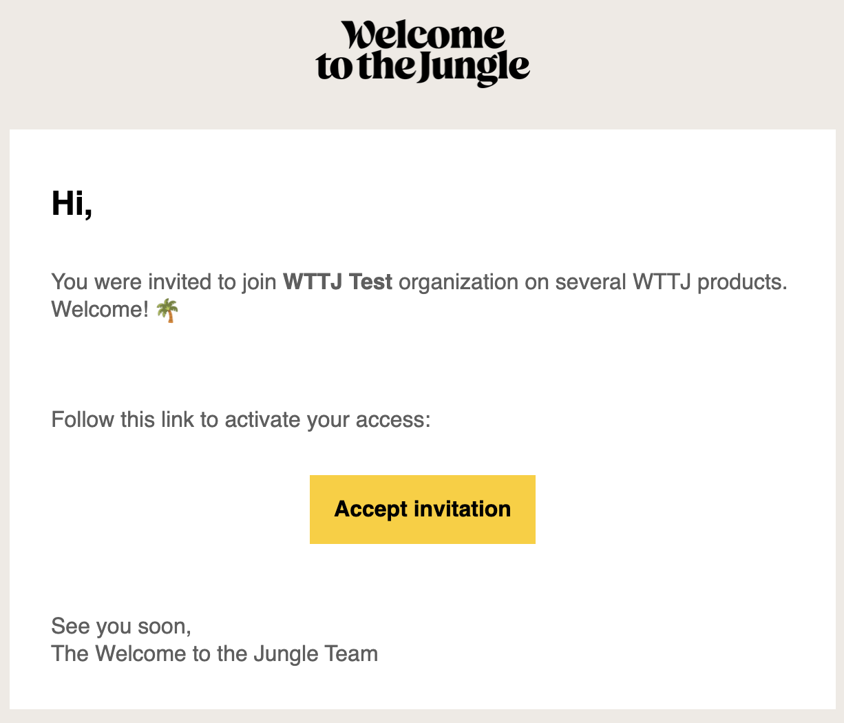- Un email est envoyé par cette adresse mail : contact@wttj.co, avec cet objet : "Rejoignez votre équipe sur Welcome to the Jungle".