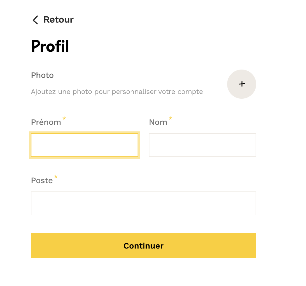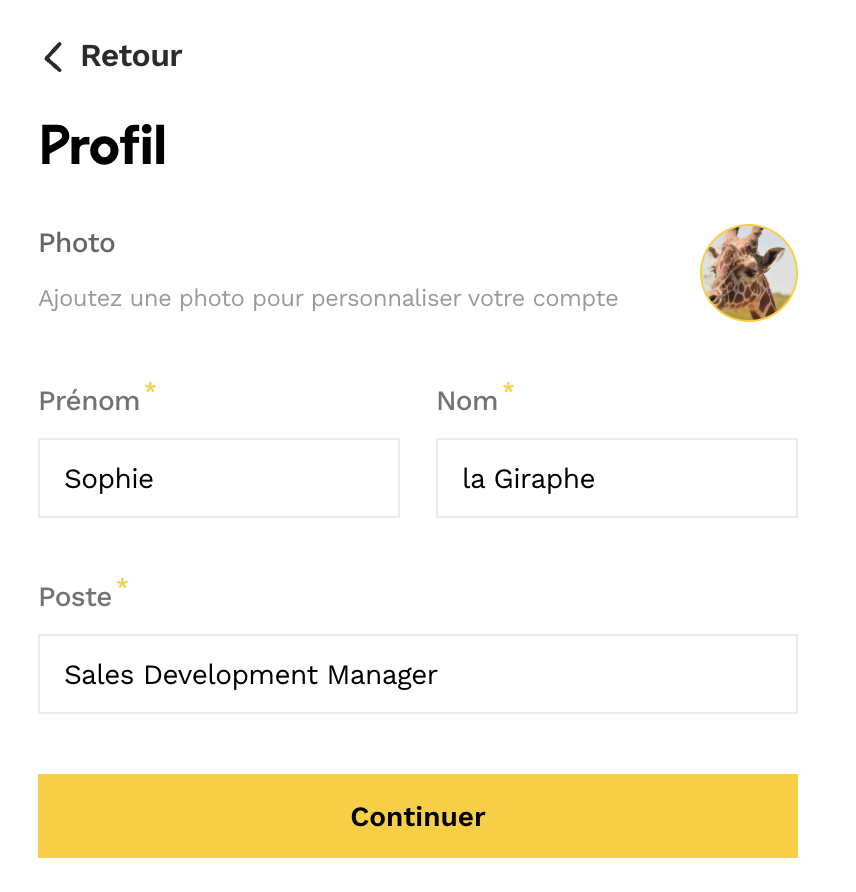 - Vous devez également renseigner votre nom, prénom, et intitulé de poste. Ce dernier sera utile pour que les collaborateurs puissent avoir une vue d’ensemble des rôles dans l’entreprise.