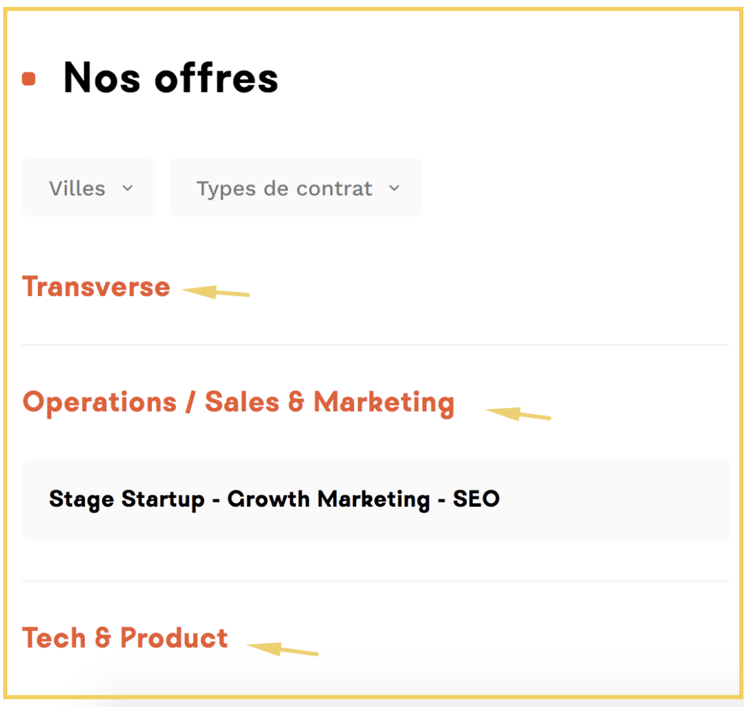 Veuillez noter que les seuls critères de tri sur WTTJ sont des champs associés aux offres (professions, et secteurs), et non pas les départements qui sont réservés à votre usage interne.