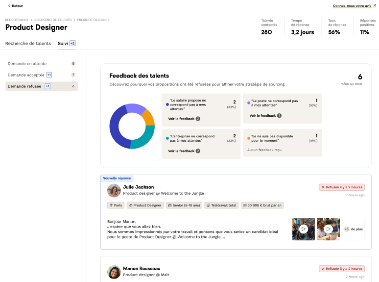 Dans la partie âPropositions dĂ©clinĂ©esâ vous aurez Ă©galement accĂšs aux raisons de refus des talents. Des feedbacks Ă prendre en compte pour les prochains Sourcing !
