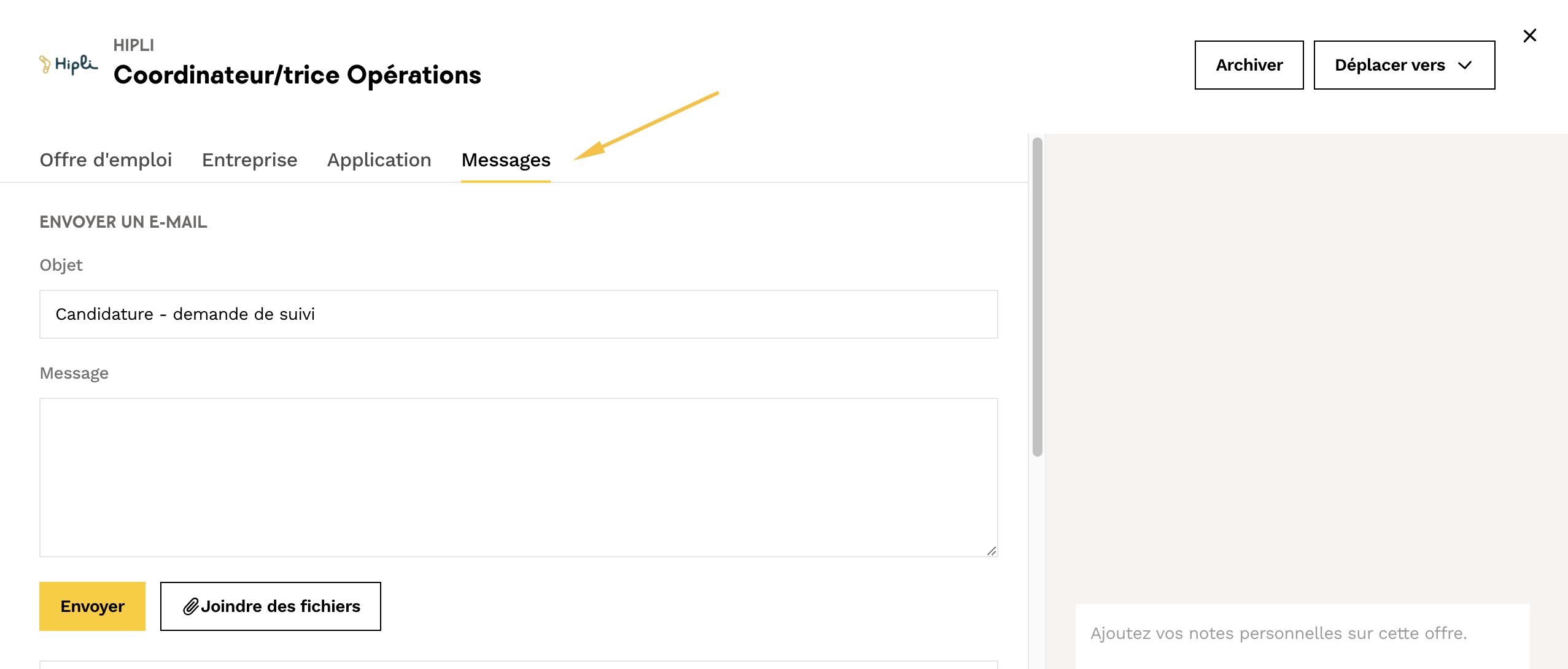 💡 En cliquant sur la candidature en cours, vous pouvez envoyer un mail aux recruteurs pour corriger votre lettre de motivation, ajouter des détails, ou relancer le process :