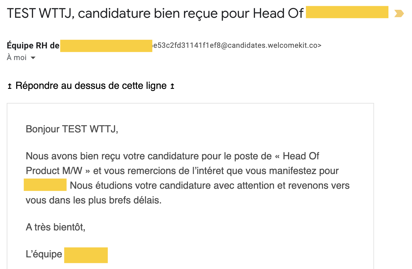 En parallèle, pour suivre votre candidature, vous pouvez tenter de répondre au mail de confirmation que vous avez reçu. L'entreprise reviendra vers vous directement par mail, une fois votre candidature traitée.