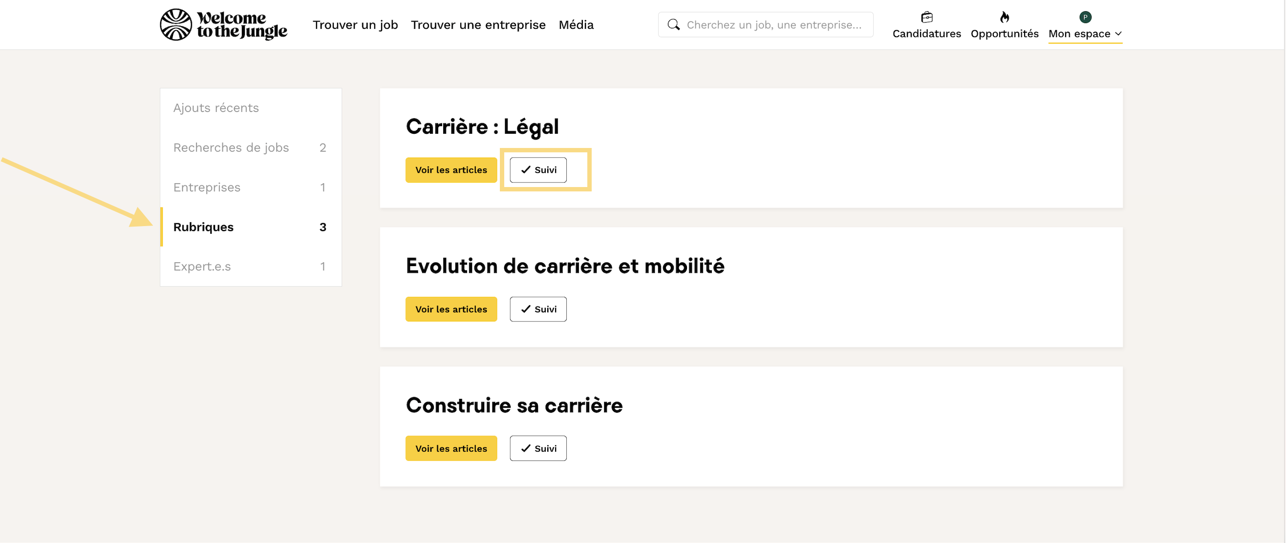 - Choisissez "Rubriques" ou les "Experts" et cliquez sur le bouton gris "Suivi"