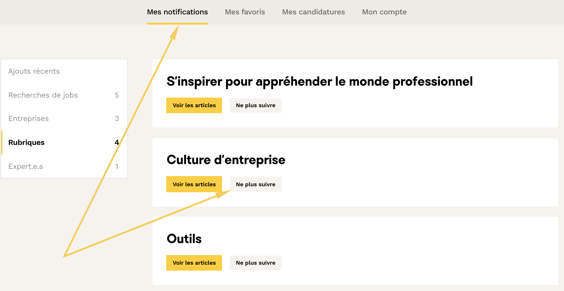 De la même façon que pour les alertes jobs et entreprises, il se peut que vos domaines d'intérêt changent ou évoluent, ou que vous aviez postulé à un job que vous aviez placé en "Favori".