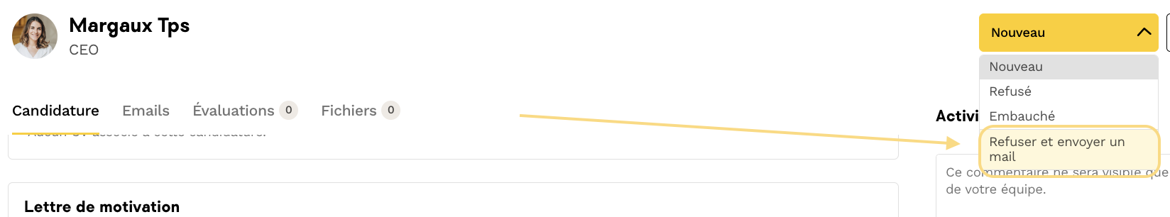 - Refusé et Embauché : Ces deux statuts finaux correspondent aux colonnes du même nom dans votre pipeline. Nous recommandons d'envoyer un email personnalisé avant de déplacer un candidat vers ces colonnes importantes.