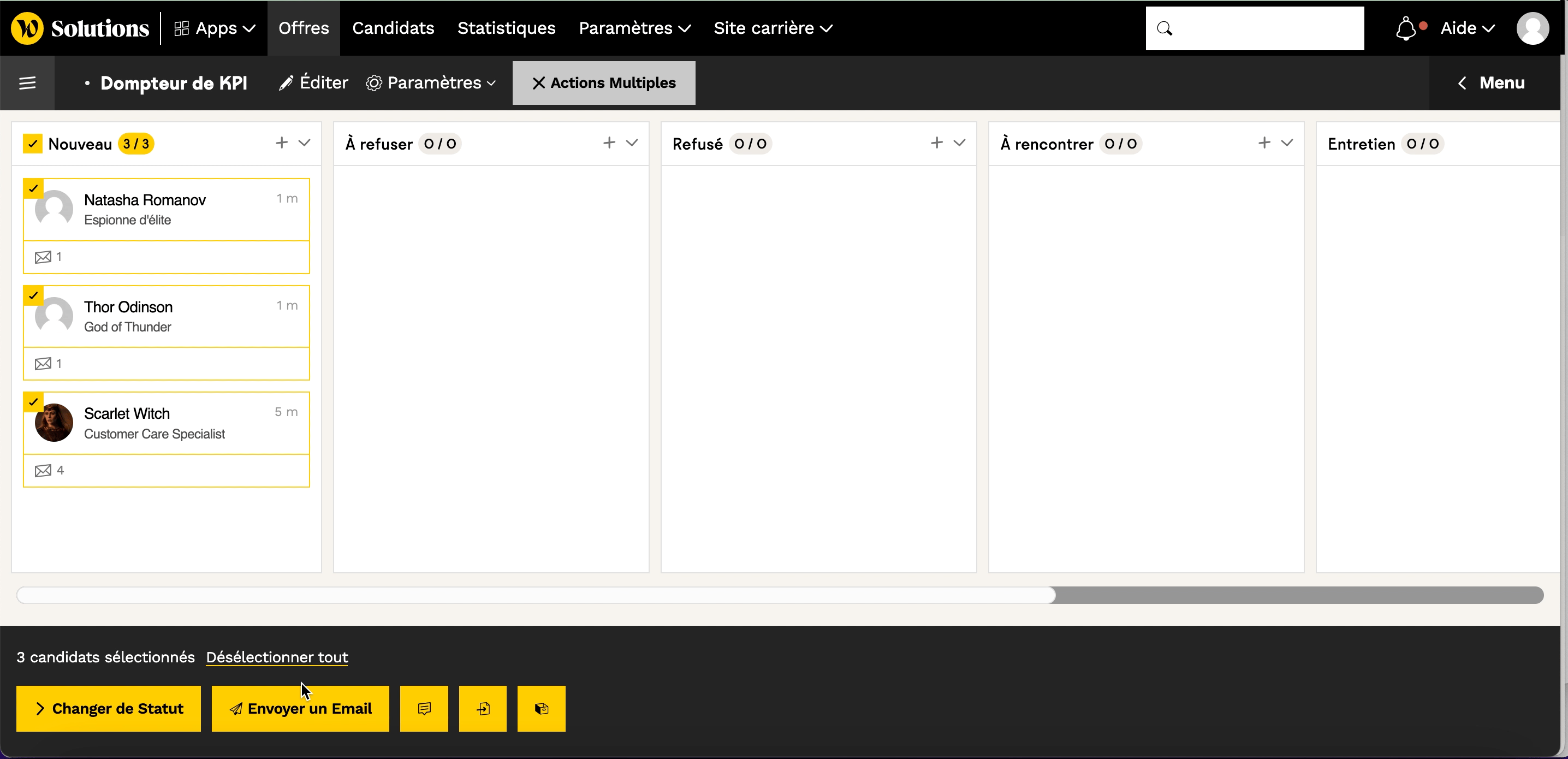 Lorsque vous recevez de nombreuses candidatures régulièrement, utilisez la colonne "À refuser" pour vous assurer que tous les candidats reçoivent une réponse plutôt que de laisser des candidatures sans réponse.⚡ Optimiser son temps avec les actions multiples