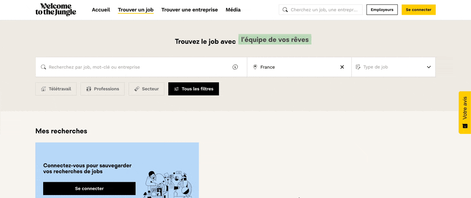 Welcome to the Jungle offre aux candidats plusieurs moyens de rechercher des opportunités professionnelles. Ils peuvent effectuer leurs recherches par :- Nom d'entreprise