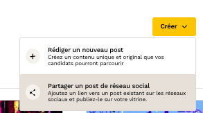 Ajoutez un lien vers un post existant sur les réseaux sociaux et publiez-le sur votre vitrine. Il vous suffit depuis le module de cliquer sur "Créer" et sélectionner "Partager un post de réseau social".